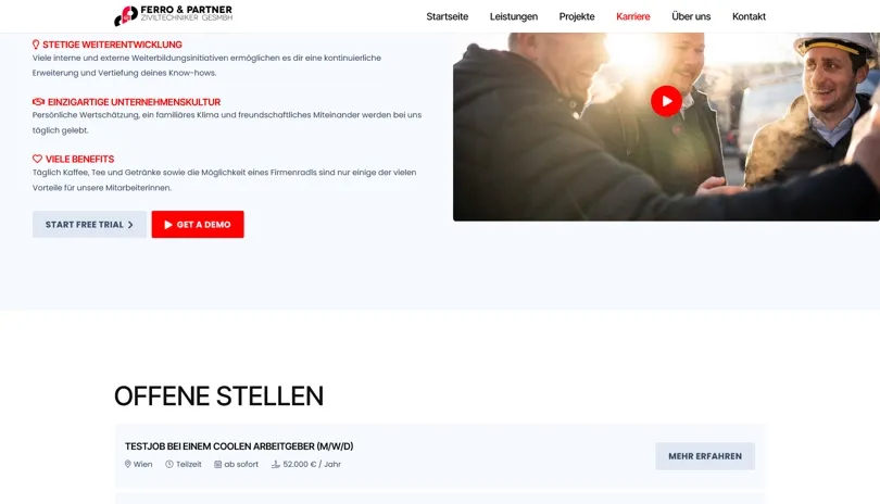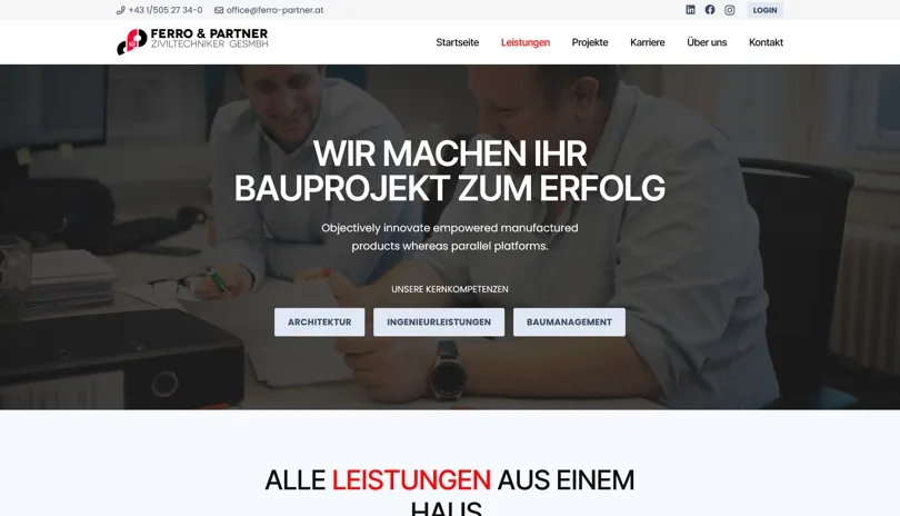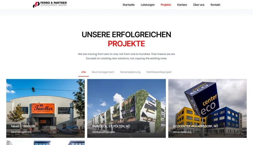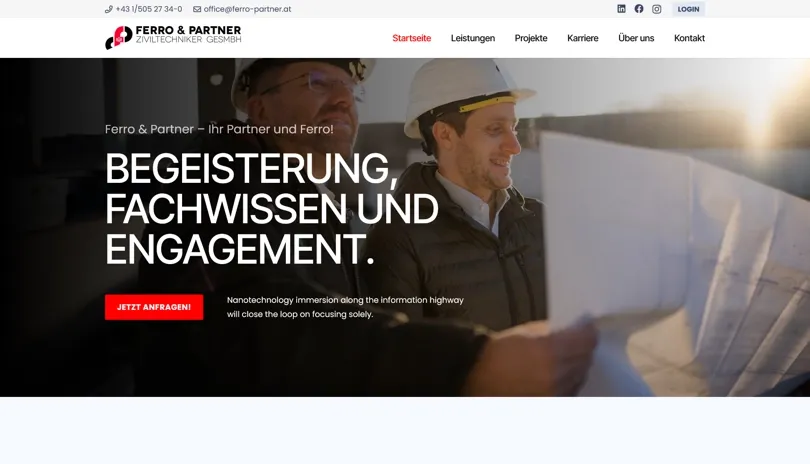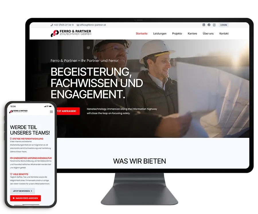 'Für über 45 Jahre kontinuierlichen Einsatz für unsere Projektpartner mit Begeisterung, Fachwissen und Engagement.' - so wirbt das langjährig bestehende Unternehmen FERRO & PARTNER Ziviltechniker GesmbH. Ein professioneller Ruf, über Jahre aufgebaut - dies sollte nun auch mit der geeigneten modernen und individuellen Webseite unterstrichen werden!